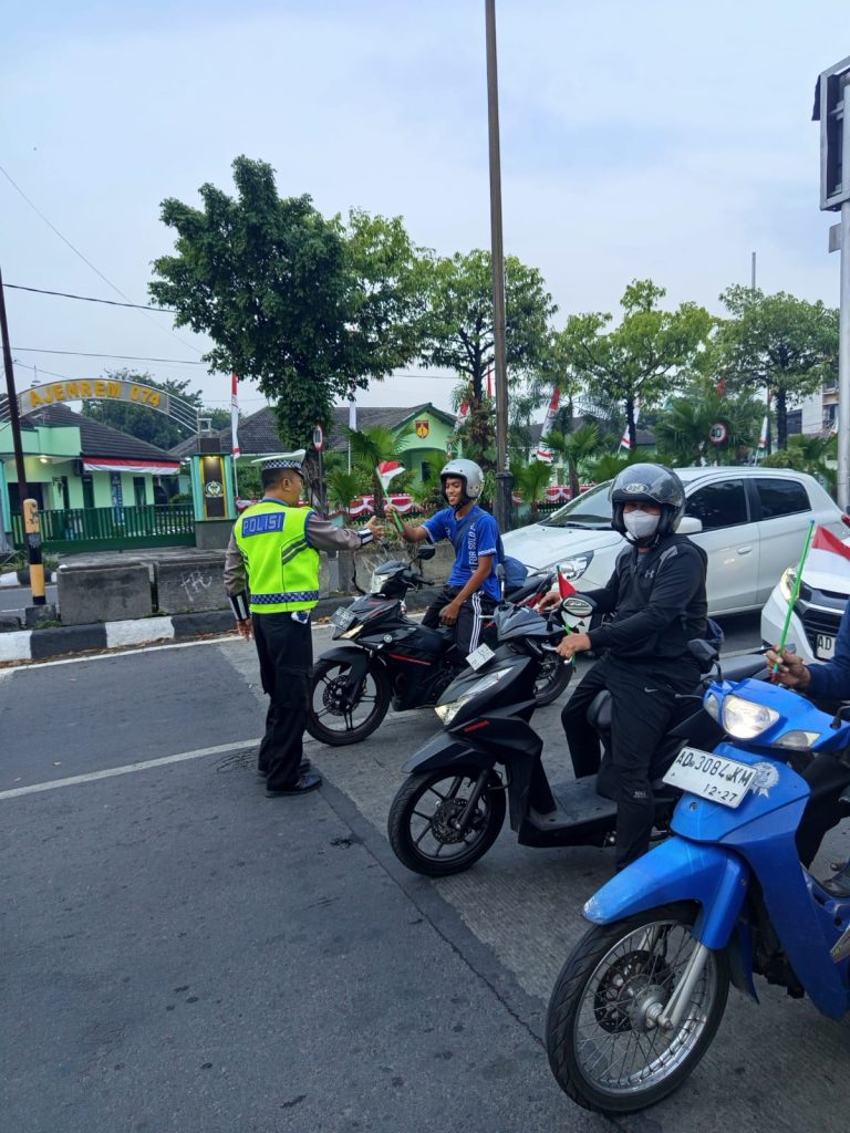 Kegiatan dipimpin langsung oleh Kasat Lantas Polresta Surakarta Kompol Agung Yudiawan, S.H., S.I.K., M.H., bersama jajaran personel Sat Lantas. Pengendara kendaraan bermotor tampak antusias menerima bendera kecil yang diserahkan sambil diimbau untuk mengibarkannya selama bulan kemerdekaan.